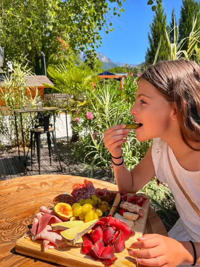 A l’extérieur, on prend l’apéro au soleil, on joue à la pétanque, on profite du bar sous les guirlandes.